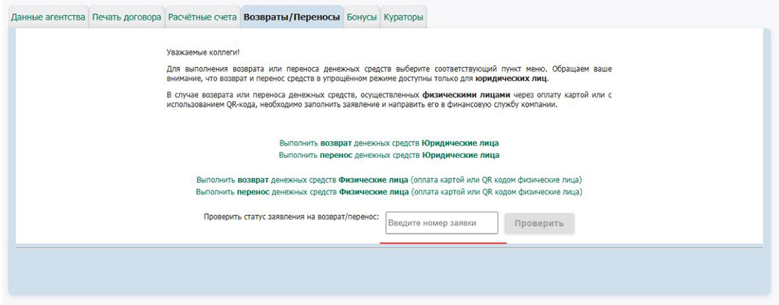 После этого действия заявление фиксируется во внутреннем реестре и статус по нему можно узнать на вкладке «Возвраты и переносы», если ввести номер заказа в соответствующем поле внизу страницы