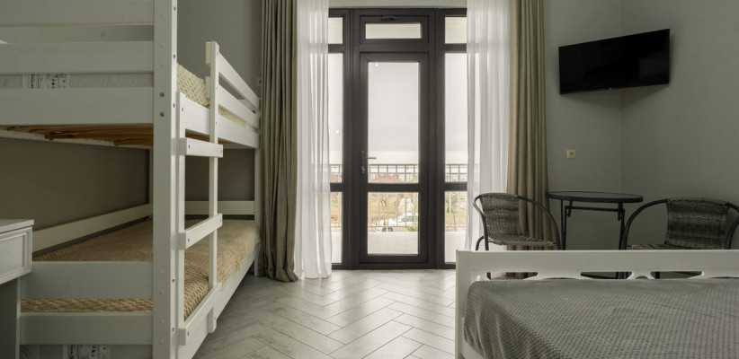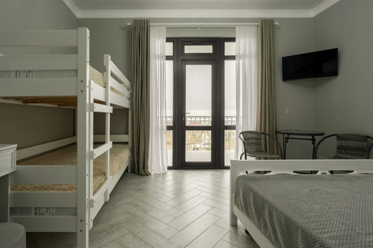 двуспальная кровать, двухъярусная кровать, рабочая зона, балкон. Количество гостей: 4.Люкс