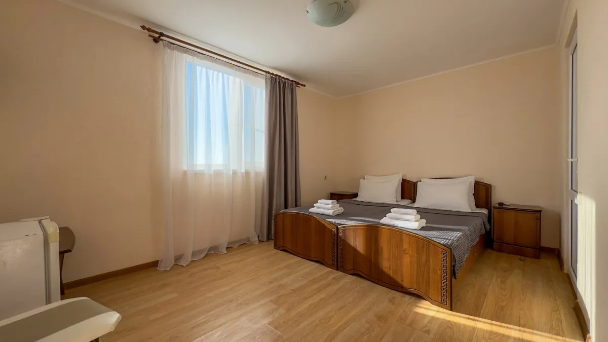 45 м2. 2+2, №4, 6, 16, 17. Одна двуспальная кровать 160х200 см, прикроватные столики, шкаф-гардероб, журнальный стол, стул, настенное зеркало. Меблированный балкон. Доп. место: диван-кровать, размер: 140х190 см. Один ребенок до 2 лет – можно без отдельного спального места. Количество гостей: 4