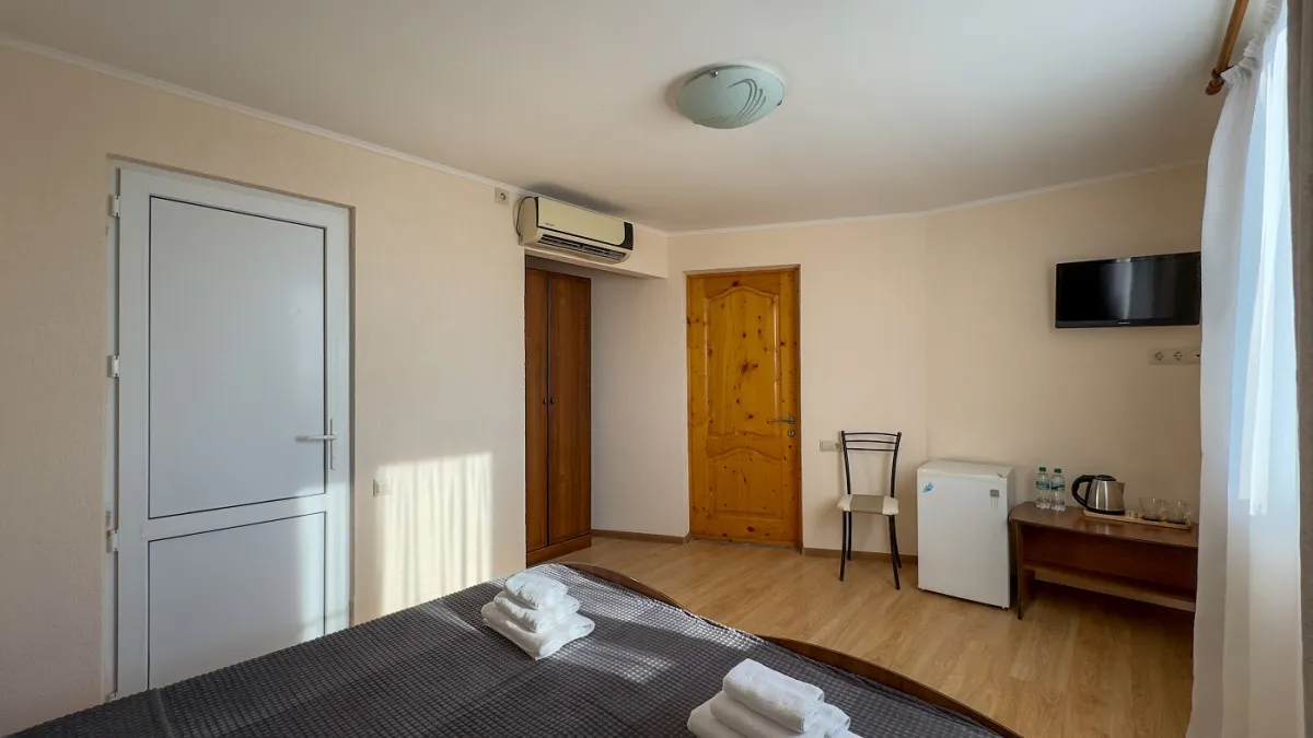 18 м2. №2, 19, 20, 21, 22 – все двухместные. Две односпальные кровати 90х200 см или одна двуспальная кровать 160х200 см, прикроватные тумбы, шкаф-гардероб, журнальный стол, стул, настенное зеркало. Общая терраса. Один ребенок до 2 лет – можно без отдельного спального места. Количество гостей: 23 Двухместный однокомнатный Standart с балконом