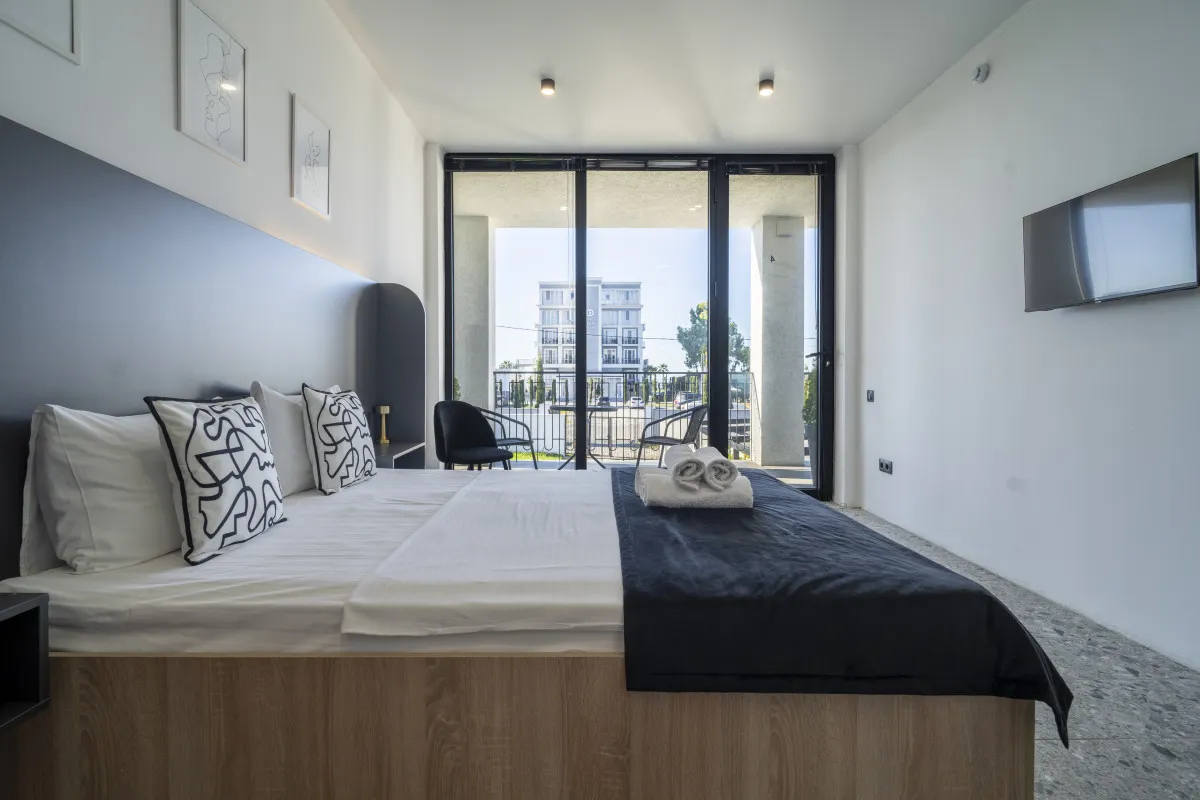 22 м2, двухместный однокомнатный номер с балконом и видом на море. В номере: двуспальная кровать, панорамные окна, 2 тумбы, мини-холодильник, рабочий стол и стул, кондиционер, набор для приготовления чая и кофе, бутилированная вода, шкаф для одежды, вешалки, ТВ. В ванной комнате: душ, санузел, раковина, зеркало, банные полотенца, халат и тапочки, гигиенические принадлежности, фен. Размещение (макс.количество человек) – 2 основных места + 1 ребенок до 5 лет без места (спит с родителями)