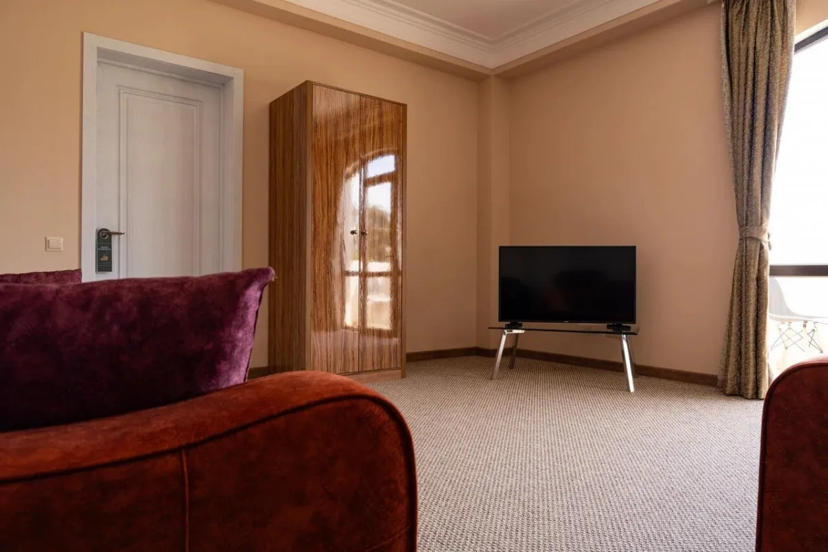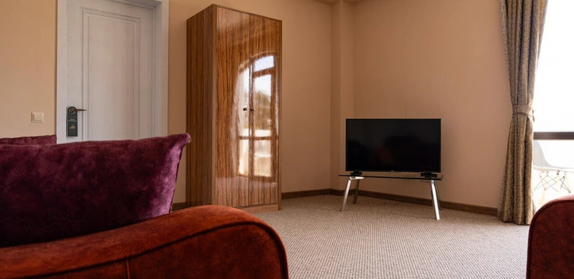 двухкомнатный номер, площадь 47 кв.м. В номере: двуспальная кровать или две раздельные, диван, стул, стол, настенное зеркало, телевизор, телефон, сплит-система, шкаф, багажница, чайный набор. В ванной комнате: раковина, санузел, ванная, гигиенические принадлежности.Джуниор Сюит с балконом и видом на море