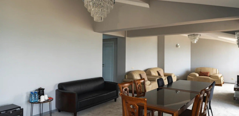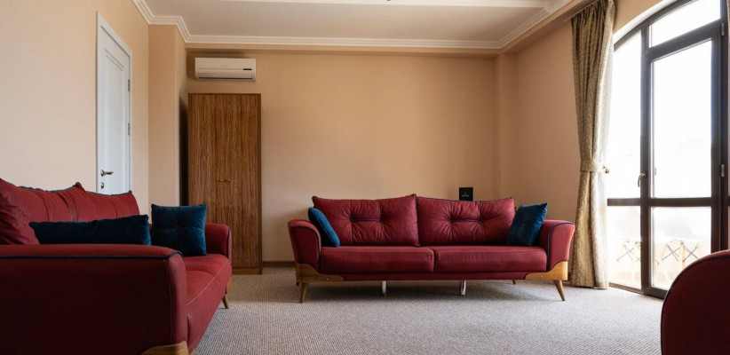трехкомнатный номер, площадь 120 кв.м. В номере: двуспальная кровать и две раздельные, диван, стул, стол, настенное зеркало, телевизор, телефон, сплит-система, шкаф, багажница, чайный набор. В ванной комнате: душ, санузел, раковина, гигиенические принадлежности.