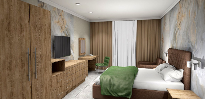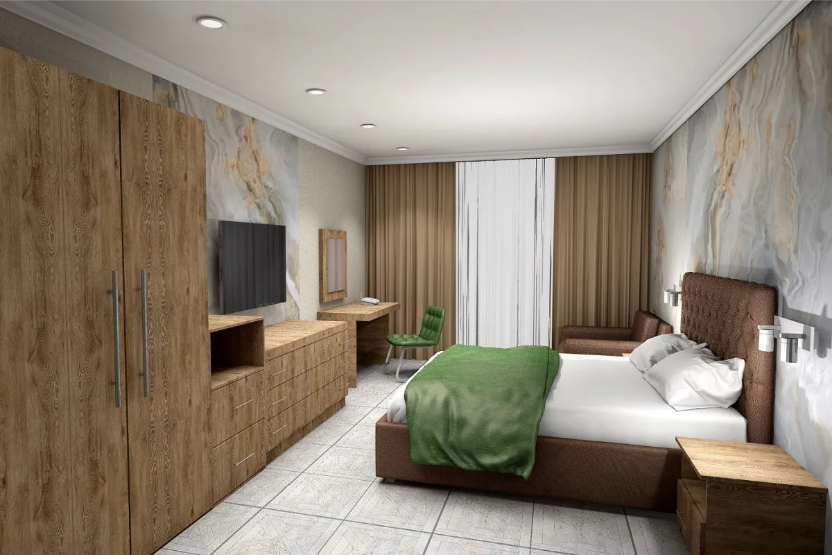 Отель является новым объектом размещения и выполнен с учетом современных требований к комфорту и дизайну. В архитектурных и интерьерных решениях сочетаются элементы современного стиля и классической эстетики. В оформлении использованы светлые натуральные материалы, панорамное остекление и уютные текстильные акценты, формирующие спокойную и функциональную среду.