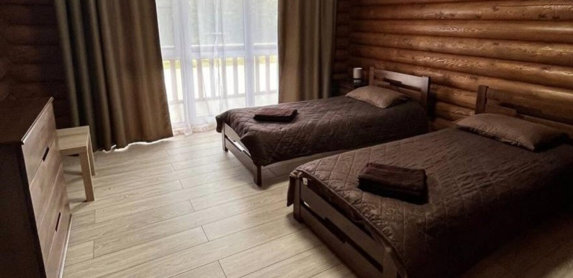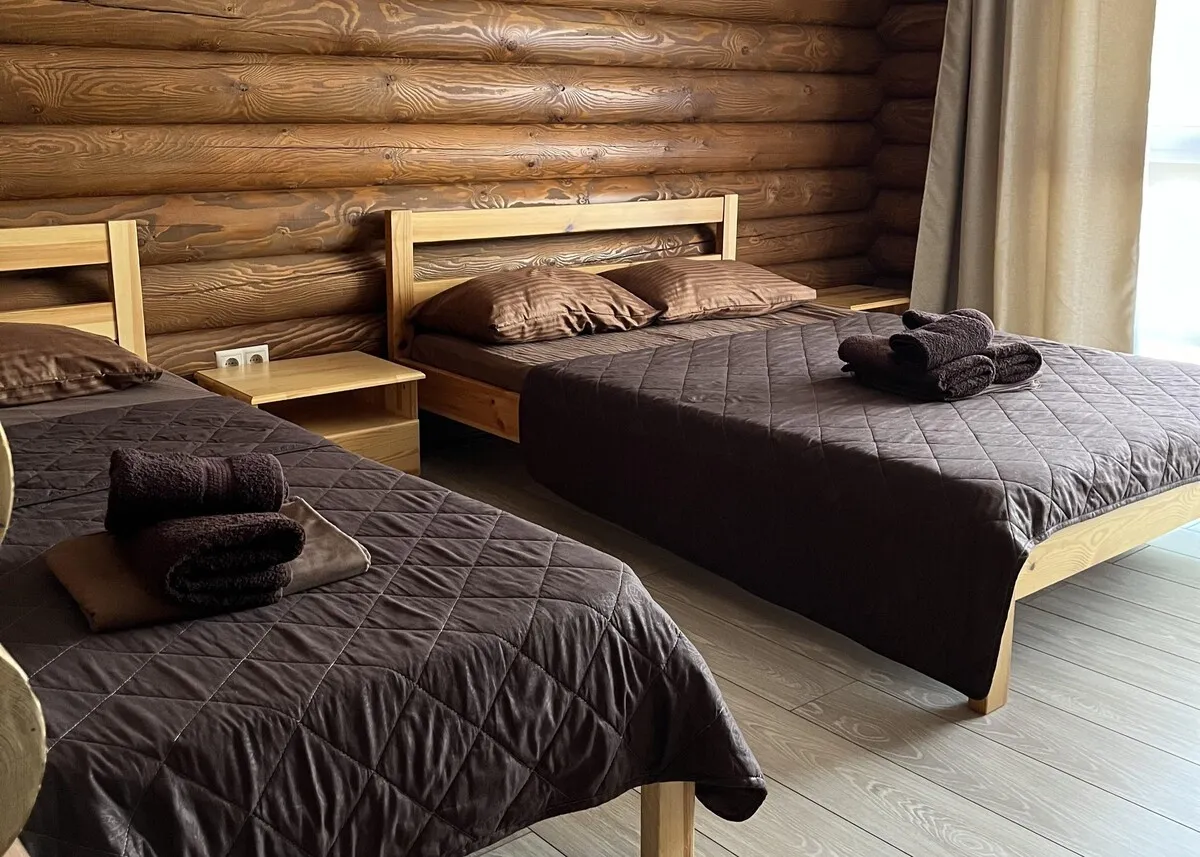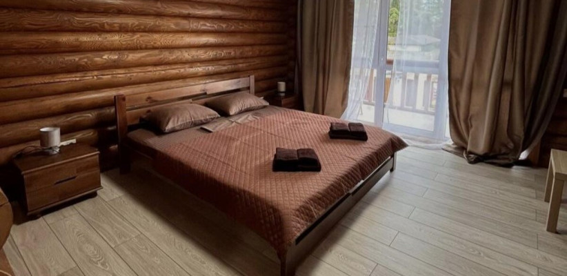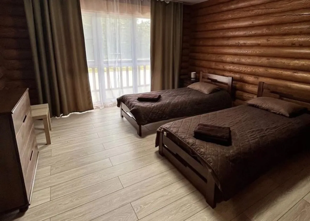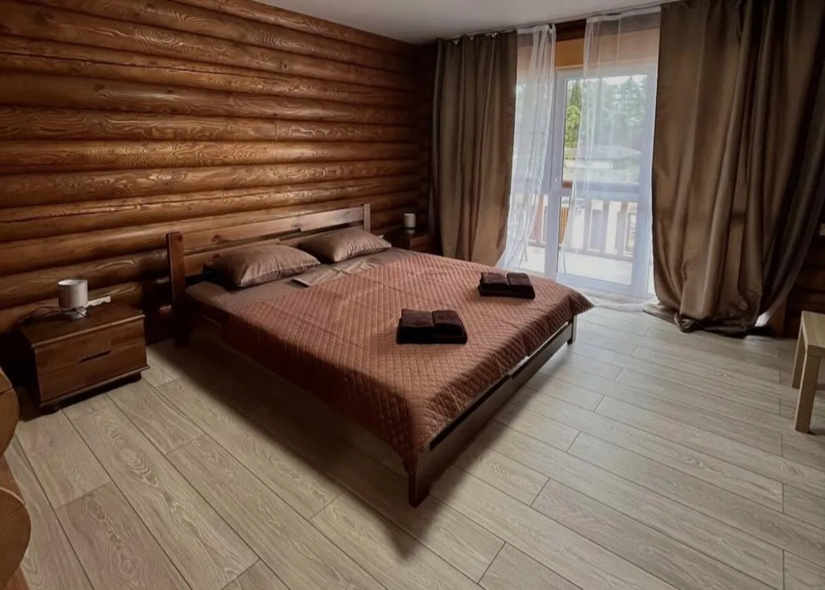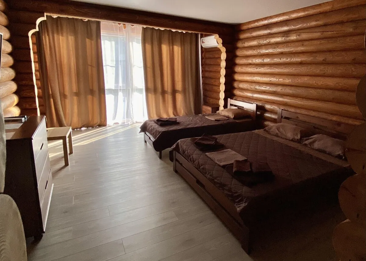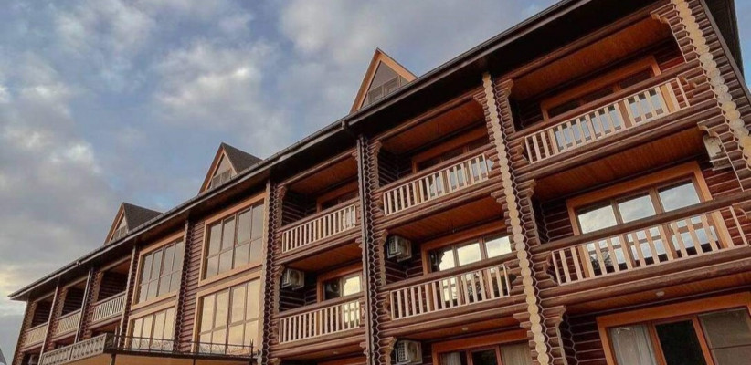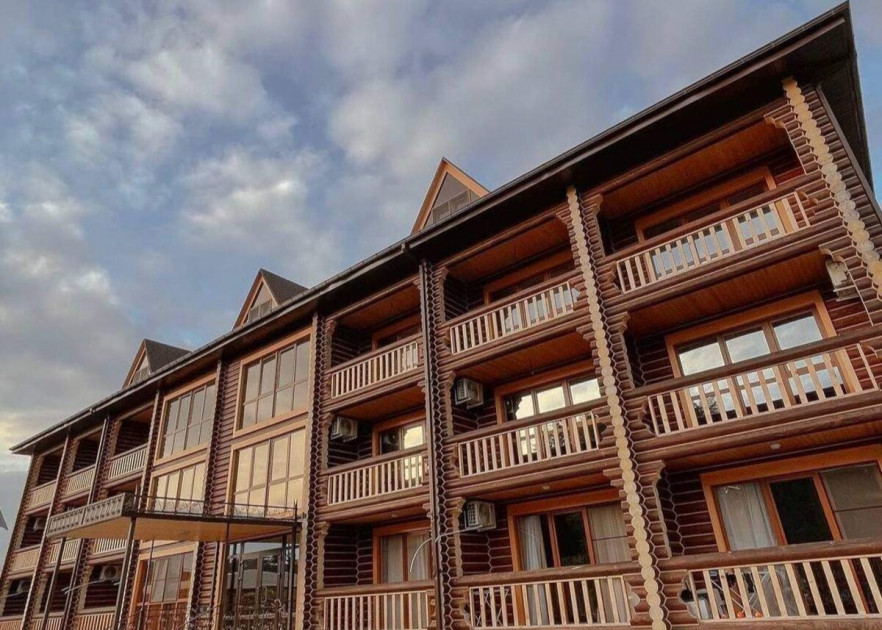 Отель представляет собой трехэтажное здание из оцилиндрованного бревна, которое гармонично сочетает в себе экологичность и комфорт. Из окон каждого номера открывается прекрасный вид на горы.