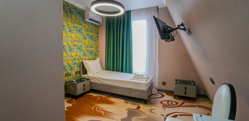 Отель располагает 135 номерами в основном корпусе различных категорий, от стандартных до люксов и полулюксов, выполненными в светлых спокойных тонах и оснащенными всем необходимым для комфортного проживанияСтандарт малый-мансарда, 1-но местный 1-но комнатный номер без балкона