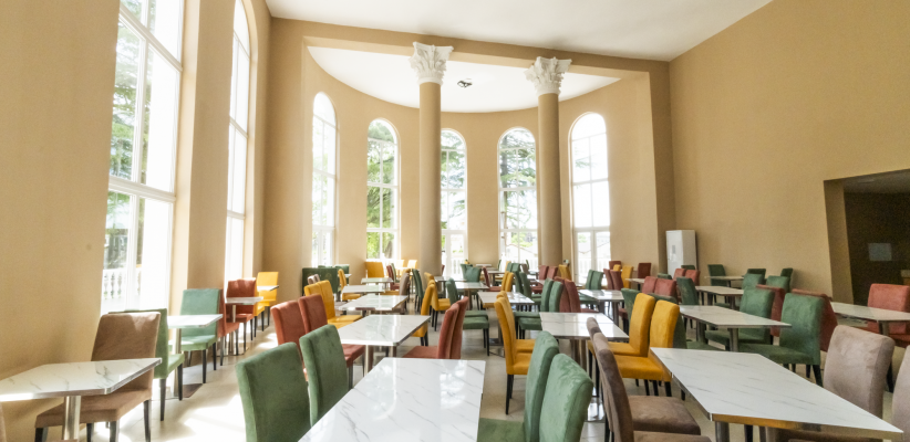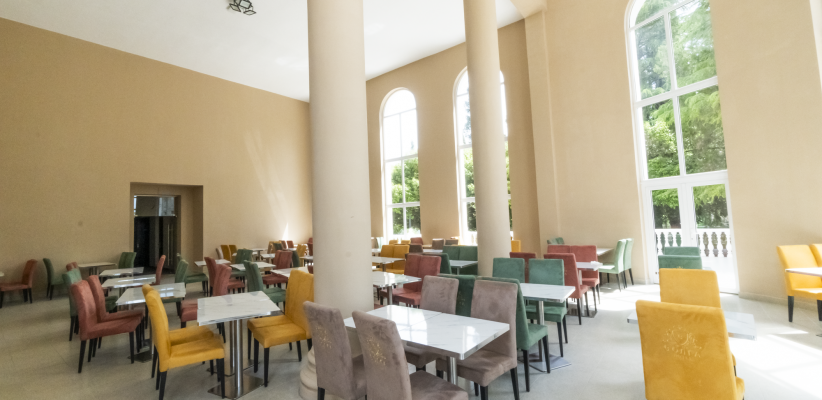 Питание организовано по системе полного пансиона с форматом «шведский стол». Трехразовое питание включает выбор горячих блюд, гарниров, салатов, закусок и простых десертов, что особенно удобно для семейных и групповых размещений.