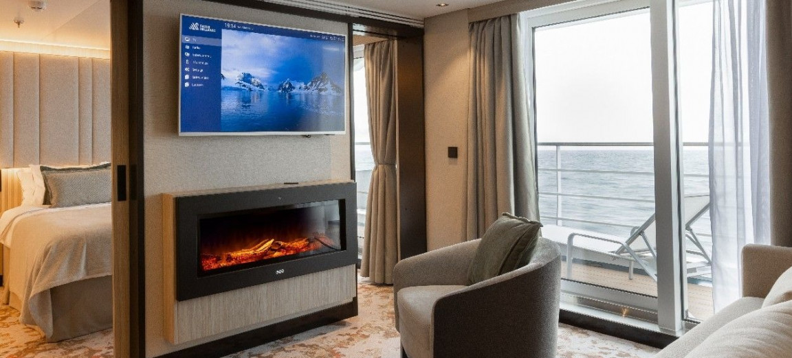 Описание: 25 м2, макс 3 чел, 5 палуба, в средней части судна: кровати размера king или twin, голографический камин с эффектом живого пламени, зона гостиной с диваном и кофейным столиком, душевая кабина, панорамный балкон 5 м2.
