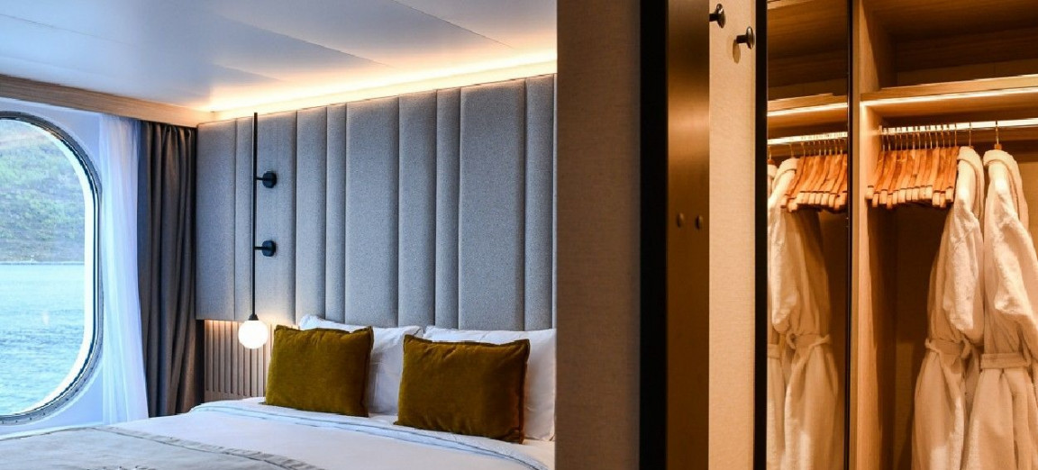 Описание: 25 м2, макс 3 чел, 5 палуба, в носовой и кормовой части судна: кровати размера king или twin, голографический камин с эффектом живого пламени, зона гостиной с диваном и кофейным столиком, душевая кабина, панорамный балкон 5 м2.