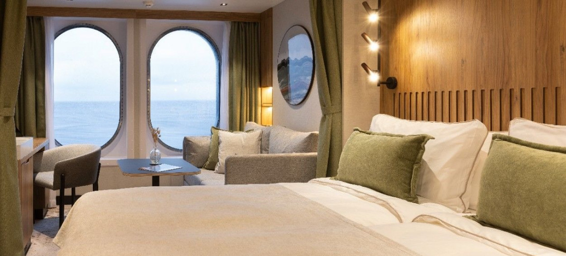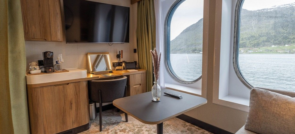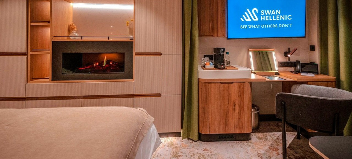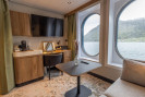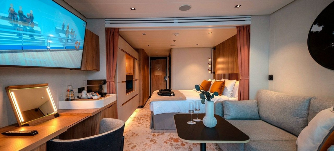 Описание: 20 м2, макс 3 чел, 4 палуба, ближе к середине судна: кровати размера king или twin, голографический камин с эффектом живого пламени, зона гостиной располагает двумя панорамными окнами, диваном и кофейным столиком, душевая кабина.