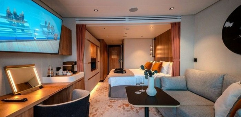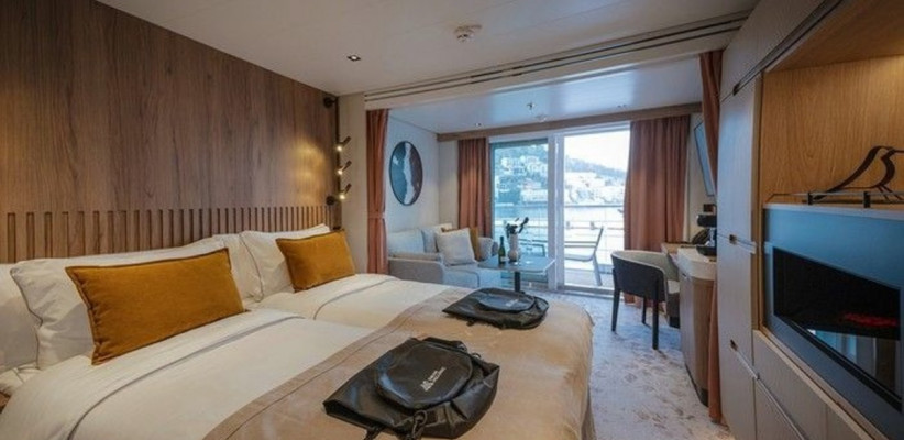 25 м2 | 2 человека | Каюты данной категории расположены на 5 палубе, в носовой и кормовой части судна. Благодаря наличию панорамного балкона 5 м2, каюта всегда наполнена светом. Зона спальни оснащена двуспальной кроватью, конвертируемой в две односпальные по запросу, и оборудована голографическим камином с эффектом живого пламени. Уютная зона гостиной располагает диваном и кофейным столиком. Завтрак на собственном балконе, отдых в зоне гостиной после насыщенного дня или послеобеденный сон – комфортное зонирование каюты позволяет гостям следовать собственным биологическим часам и не зависеть от планов своего спутника. Элегантная ванная комната оснащена душевой кабиной. |