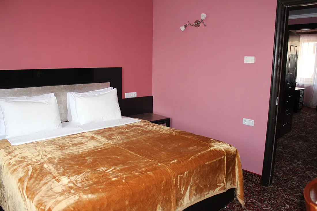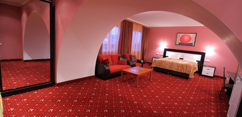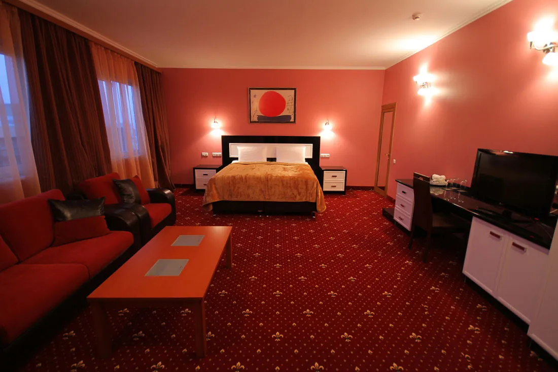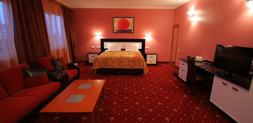40 м2, большая двуспальная кровать, зона отдыха со стульями, диваном или креслами. Количество гостей: 2+1Де люкс