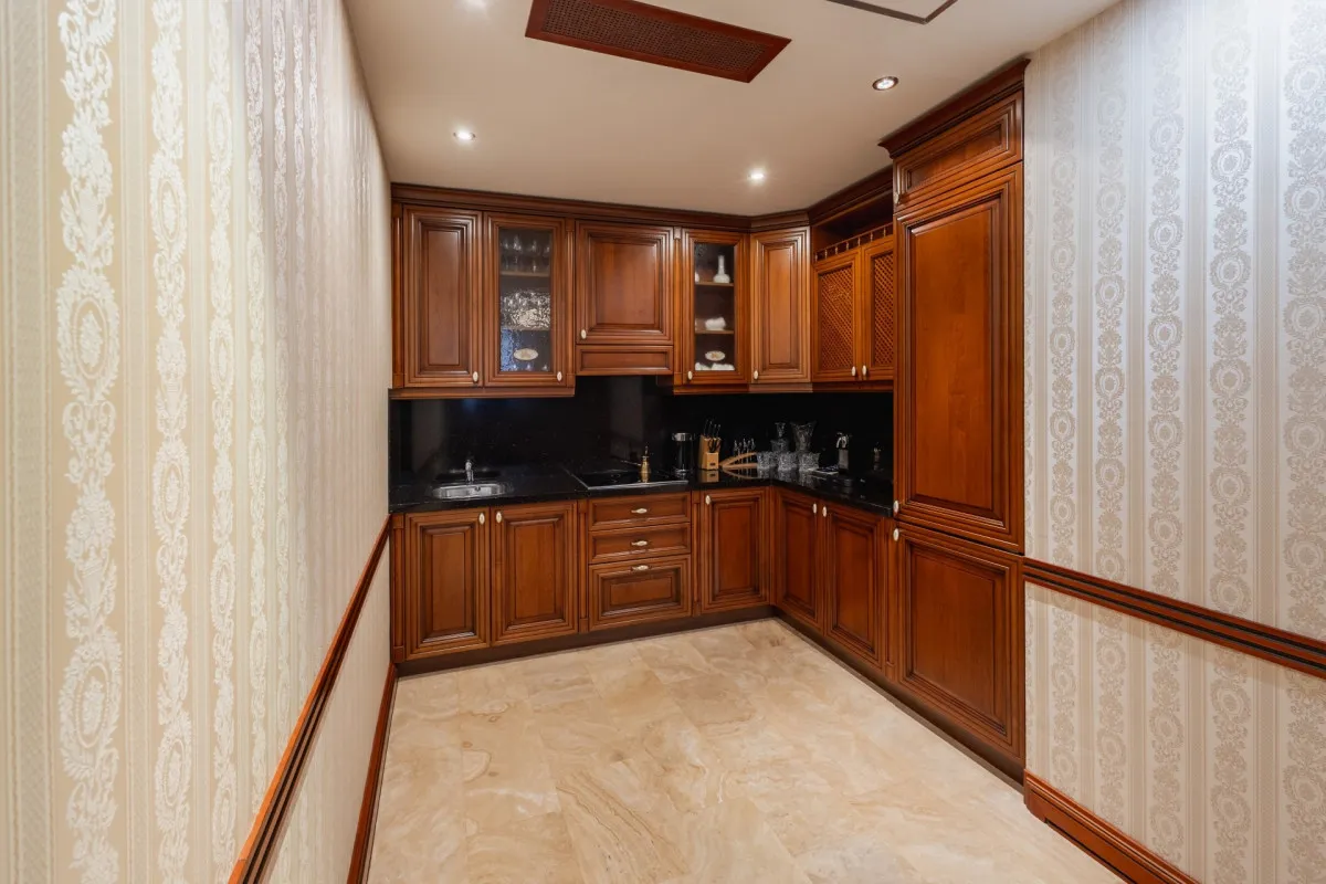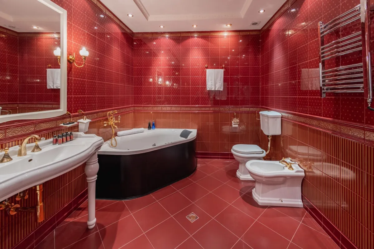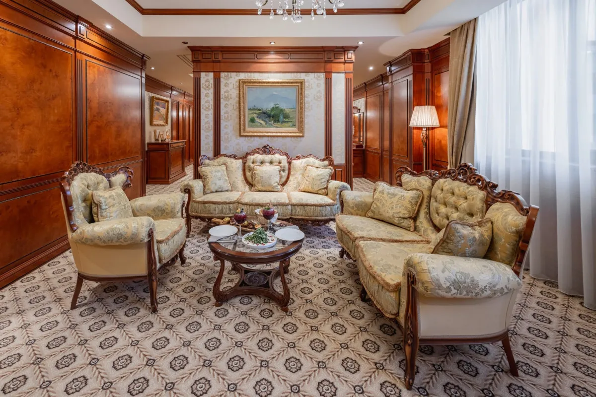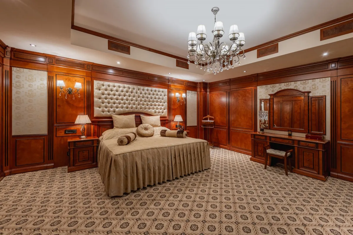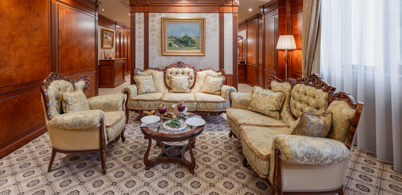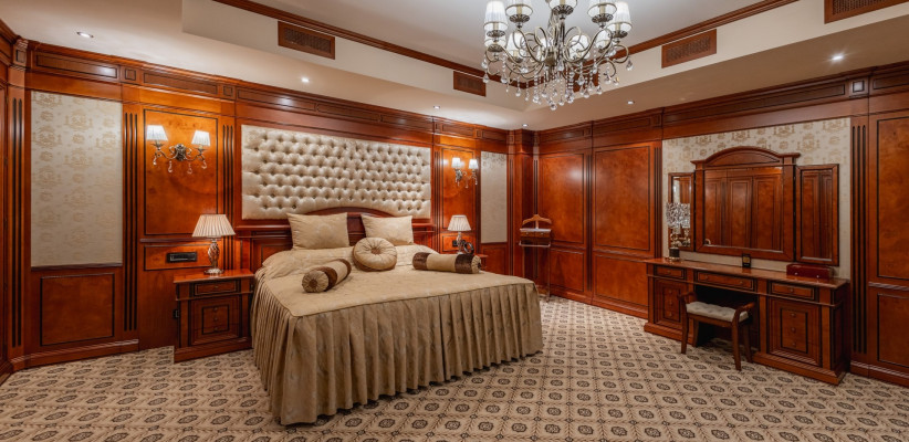 100 м2, номер с видом во двор, кровать king-size, две ванные комнаты, аэромассажная ванна, гостиная, гардеробная. Максимальное количество гостей: 4.Presidential Apartment