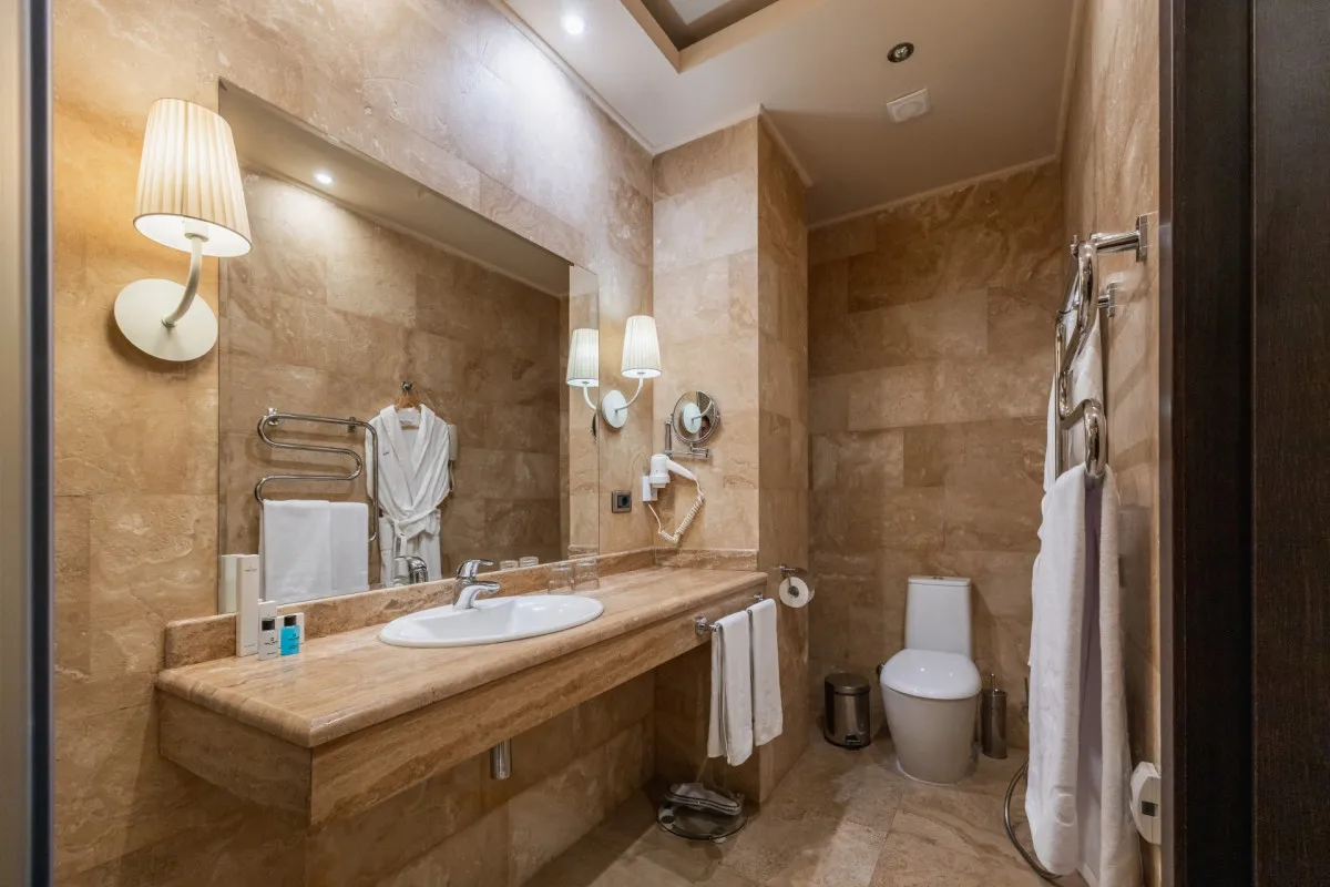 - Элегантные номера оборудованы удобными кроватями и теплыми полами, а ванные комнаты выполнены из натурального камня. Персонал обеспечивает высокий уровень обслуживания.