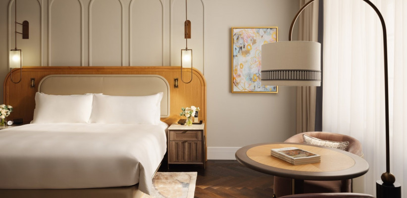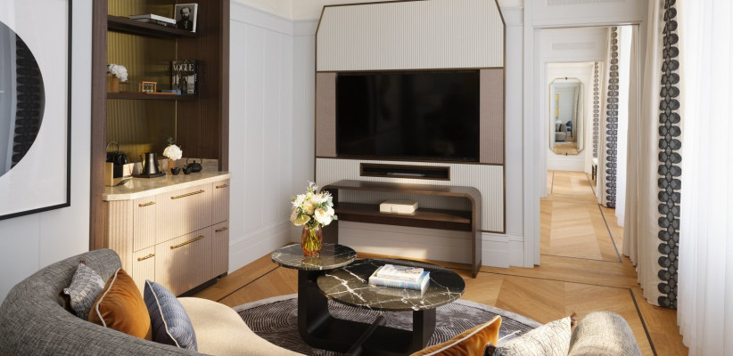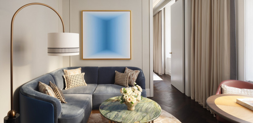 41 м2, спальня с двуспальной кроватью размера king-size, два кресла с кофейным столиком, мраморная ванная комната с плиткой в стиле ар-нуво.Deluxe Suite