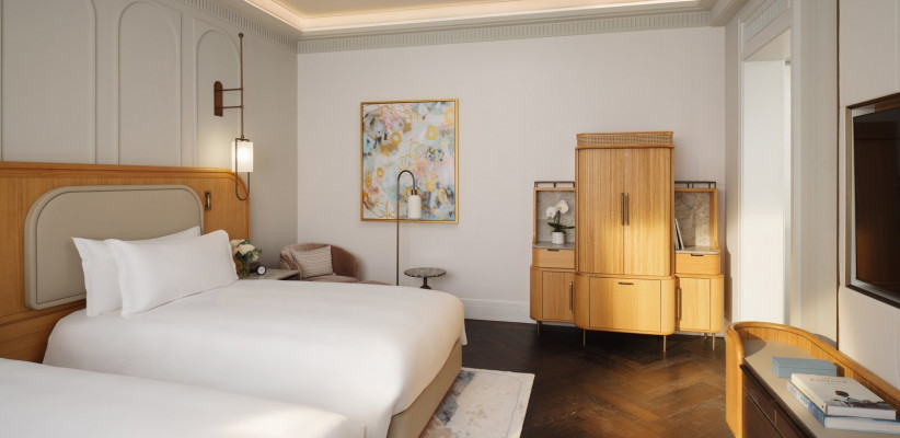 84 м2, с видом на внутренний двор, спальня с двумя двуспальными кроватями размера king-size, отдельная гостиная зона, обеденная зона, два кресла с кофейным столиком.Two-Bedroom Royal Suite