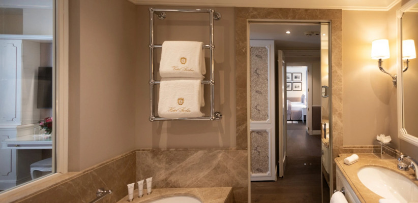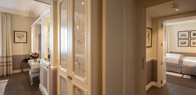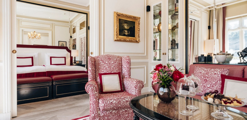 150 м2, спальня с тремя двуспальными кроватями размера king-size, гостиная, обеденная зона, два кресла с кофейным столиком, рабочее место.Sacher Sky Suite