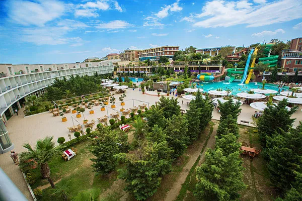 Главная гордость отеля – аквапарк с разнообразными горками и бассейнами для взрослых и детей. На территории также есть спортивные площадки для тенниса, футбола, волейбола и баскетбола, зоны для настольных игр и отдельные детские игровые площадки.