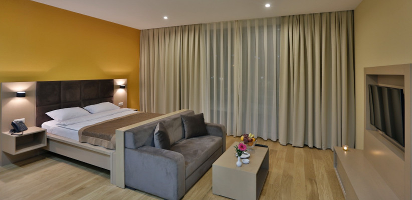 50 м2, терраса с видом на море, спальня с двуспальной кроватью размера king-size или с двумя односпальными кроватями, гостиная зона с диваном, полностью оборудованная кухня, обеденная зона, рабочее место.