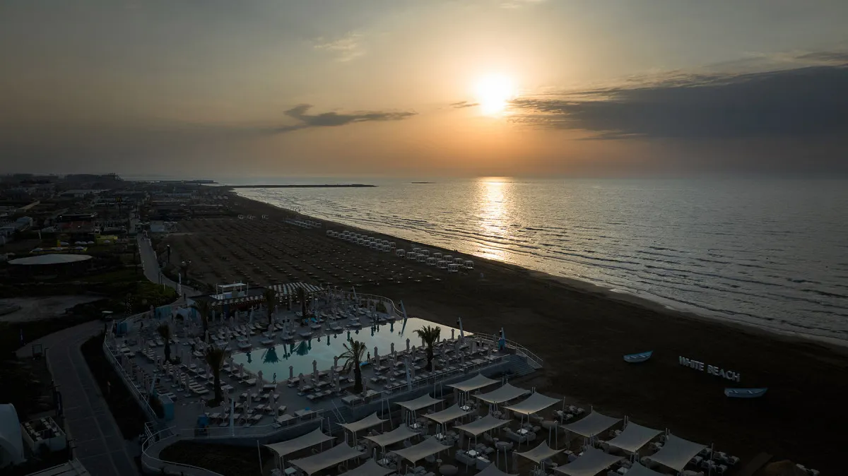 Частный песчаный пляж с пирсом и пляжным клубом.
