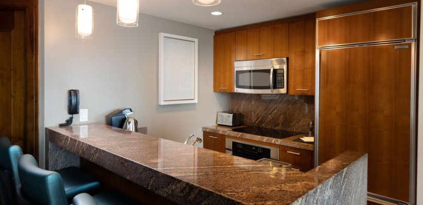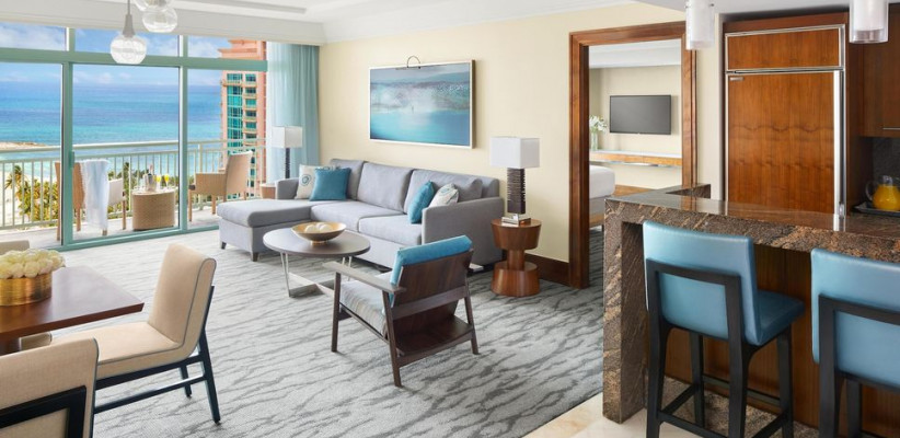 90 м2, балкон, вид на территорию курорта/ океан/ Atlantis Marina или Nassau Harbour, двуспальная кровать, гостиная, кухня, ванная комната, гостевой санузел1 Bedroom Topaz Suite