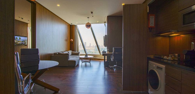 51–69 м2, с двумя односпальными кроватями, рабочим столом, зоной отдыха с диваном и креслами, мини-кухней с микроволновой печью, мини-холодильником, чайником и кофемашиной, ванной комнатой с душем и ванной, панорамными окнами с видом на Манаму или Персидский залив.King One Bedroom Suite