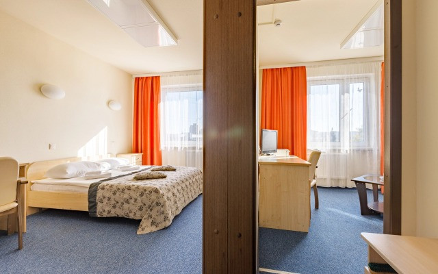 33,8 м2, две комнаты, рассчитан на 4 человека; меблировка включает двуспальную кровать, дополнительное спальное место или односпальные кровати, телевизор, Wi-Fi, письменный стол; ванная комната с душем и туалетом; количество гостей: 4Двухместный номер (для людей с ограниченными возможностями)