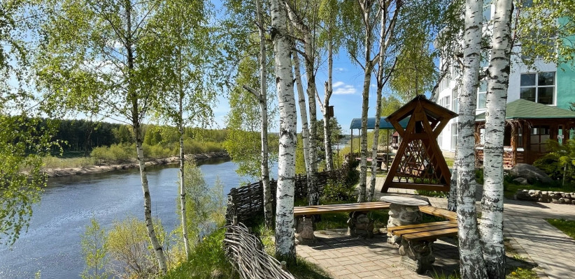 На территории отеля расположен оборудованный пляж с шезлонгами и удобным спуском к реке для купания и отдыха