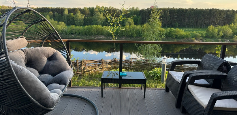 Отель располагает собственной зоной отдыха у воды. Из окон открывается панорамный вид на реку и противоположный берег Новополоцка. Для отдыха предусмотрен благоустроенный пляж с шезлонгами и доступом к воде.