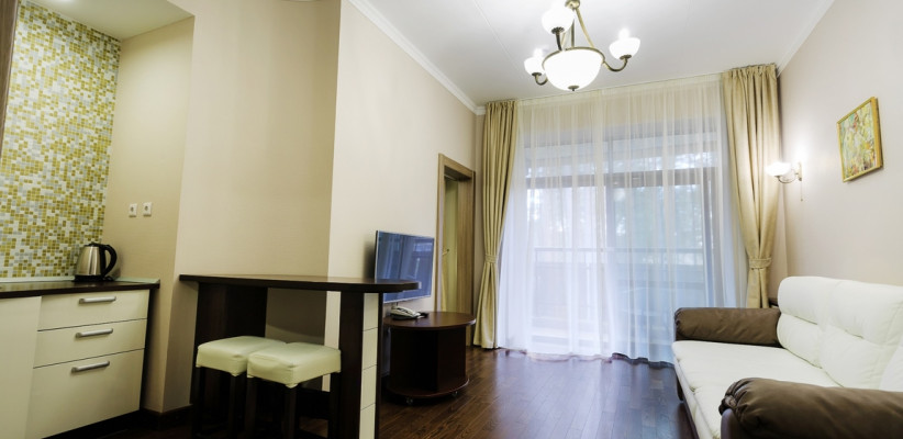 34 м2, двуспальная кровать, отдельная гостиная с раскладным диваном, вид на лес. Количество гостей: 2 + 2 на доп. местеStudio/ 2-местный 1-комнатный номер (Корпус 3)
