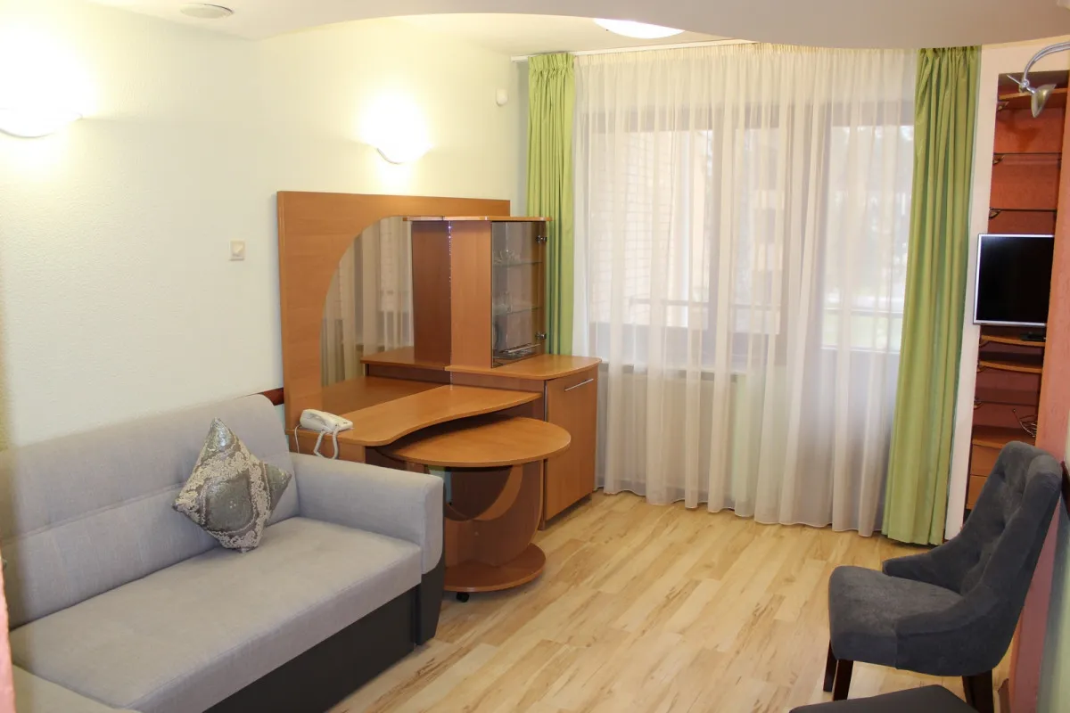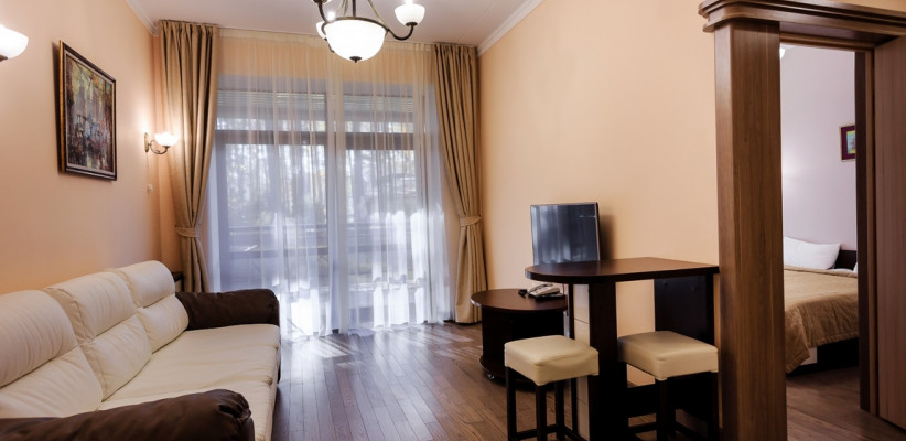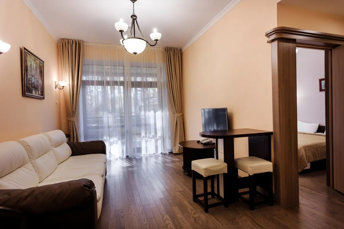 52 м2, двуспальная кровать, отдельная гостиная с раскладным диваном, мини-кухня, вид на парк или на лес. Количество гостей: 2 + 2 на доп. месте1-местный 2-комнатный номер (Корпус 2)