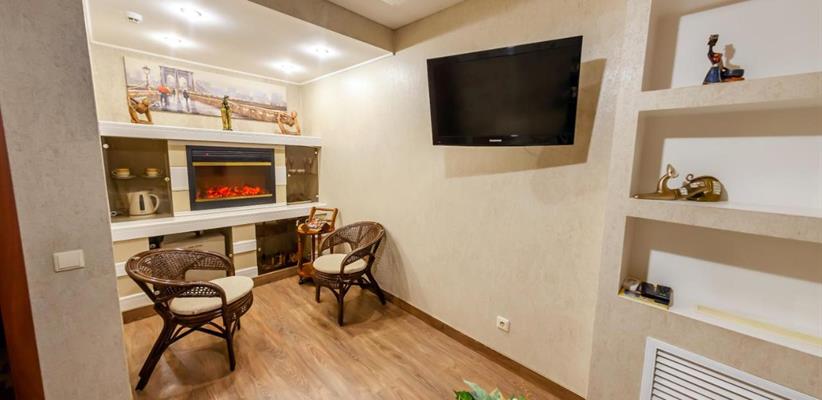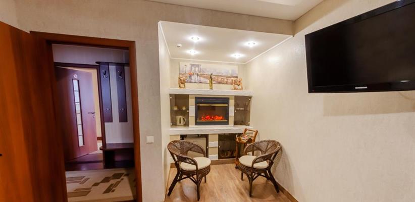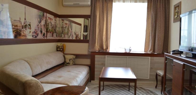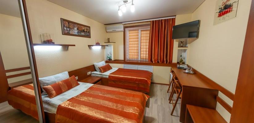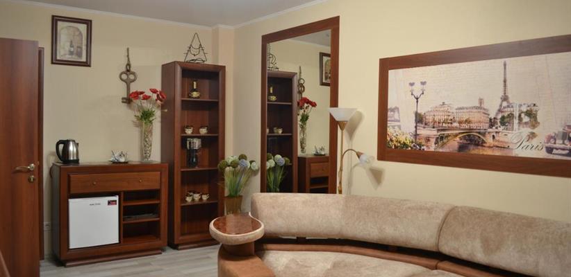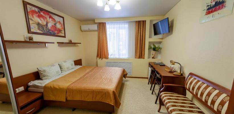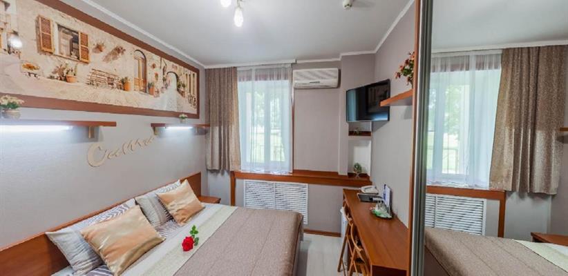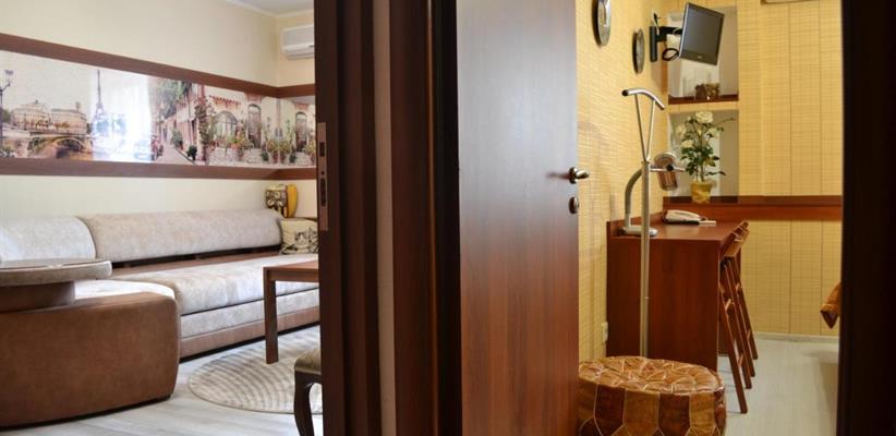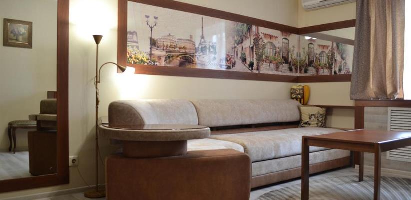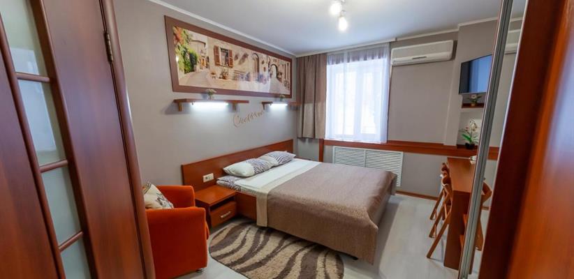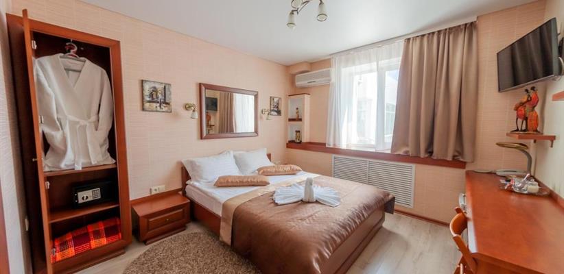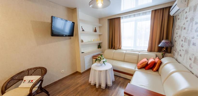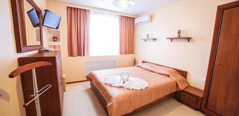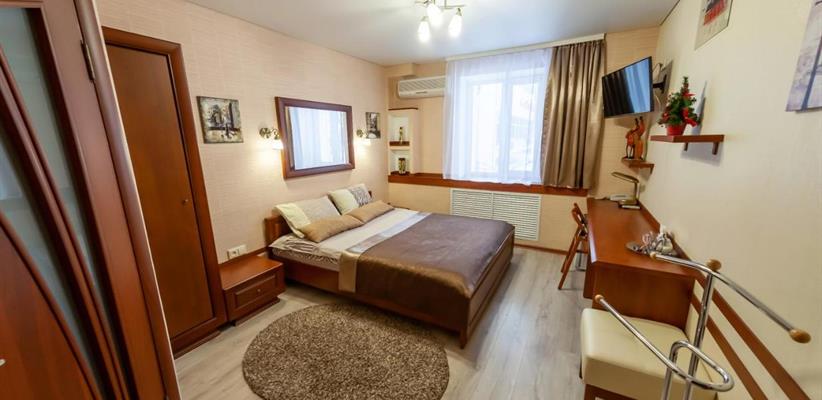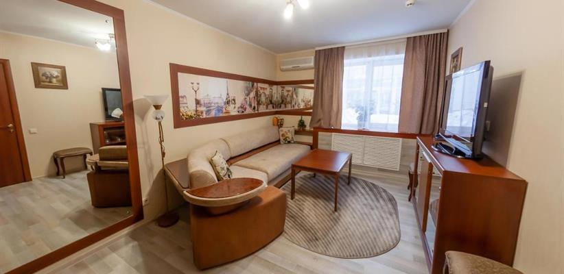 33 м2, две комнаты – спальня с двуспальной кроватью и отдельная гостиная зона, рабочая зона, шкаф, телевизор, ванная комната, количество гостей: 2 + 1Полулюкс