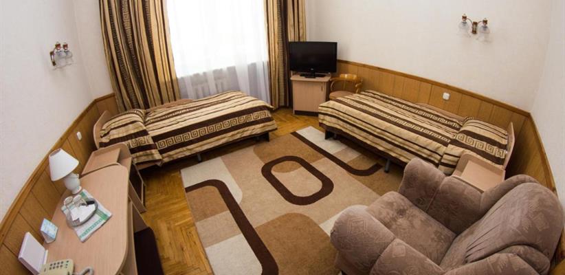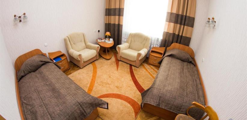 Двухместный номер: площадь 22 кв. м, две односпальные кровати, кресло, рабочее место.