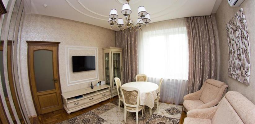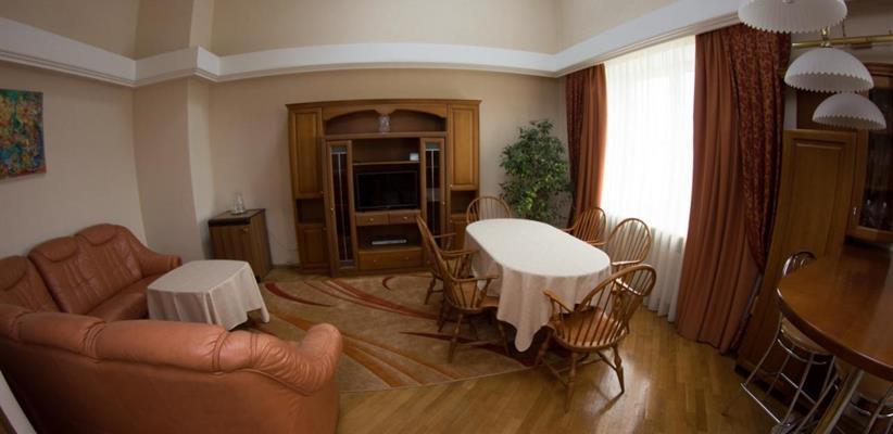 Люкс C: площадь 66 кв. м, спальная, гостиная, кухня (СВЧ, посуда), двуспальная кровать, диван, стол, стулья.