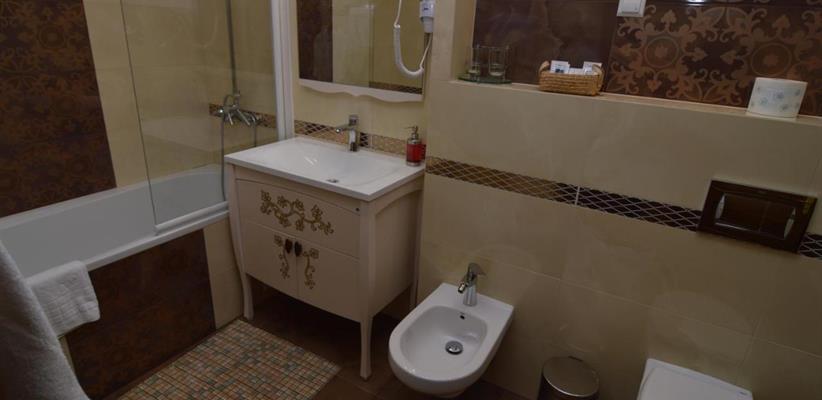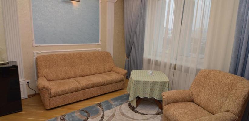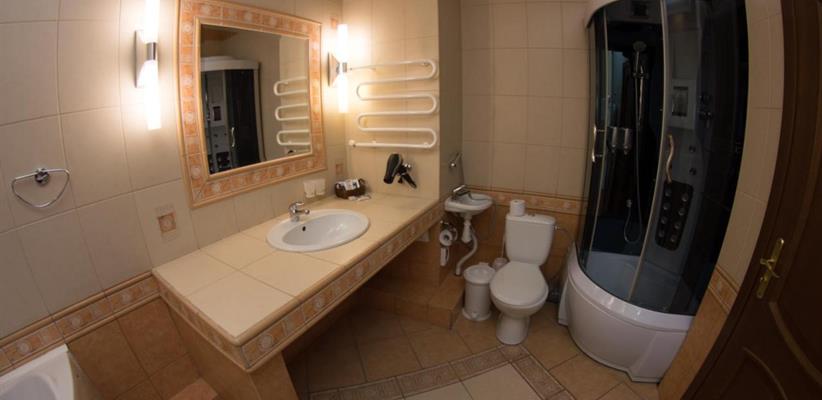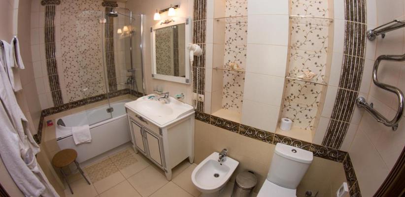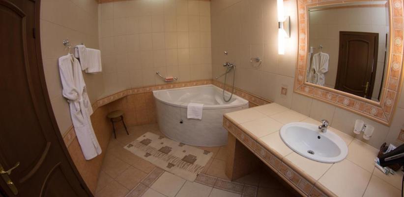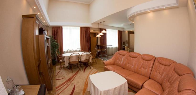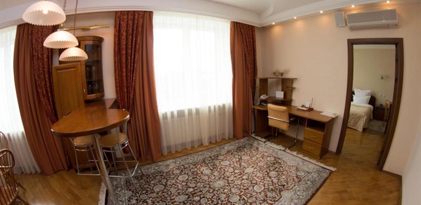 Люкс A: площадь 45 кв. м, спальня, гостиная, двуспальная кровать, диван, стол, стулья, кондиционер, мини-сейф, угловая ванна и душевая кабина, гостевой санузел.