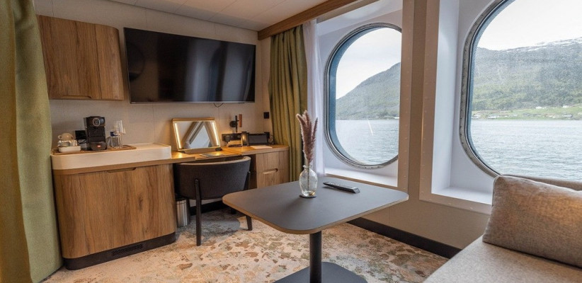 Каюты данной категории расположены на 4 палубе, в носовой части судна. Зона спальни оснащена двуспальной кроватью, конвертируемой в две односпальные по запросу, и оборудована голографическим камином с эффектом живого пламени. Уютная зона гостиной располагает двумя панорамными окнами, диваном и кофейным столиком. Элегантная ванная комната оснащена душевой кабиной.