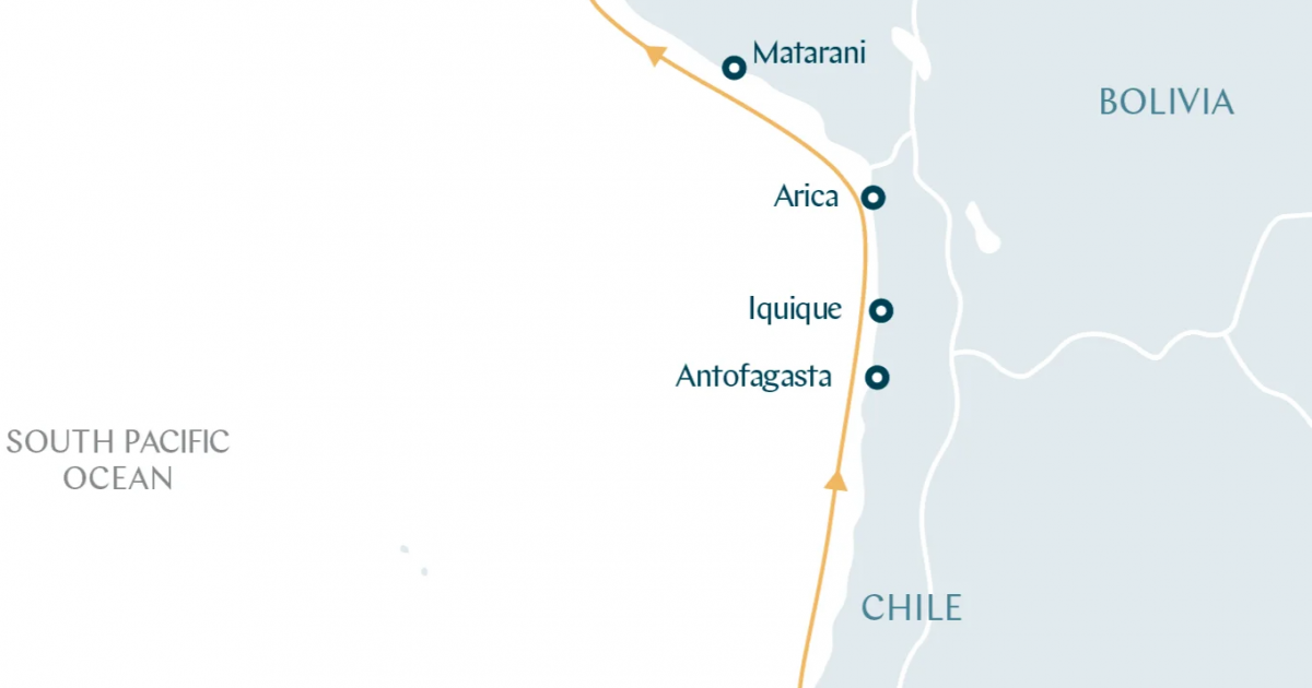 Туристы отправятся из Вальпараисо (Чили) в увлекательное путешествие вдоль засушливого побережья в Перу. Побывают в Атакаме, самой засушливой из пустынь мира. Увидят доисторические геоглифы в пустыне Паракас. Встанут под возвышающимися пиками и грозными вулканами Анд, и красота этого региона захлестнет с головой. Путешествие завершится в оживленном порту Кальяо, Лима. Круиз на судне SH Vega.