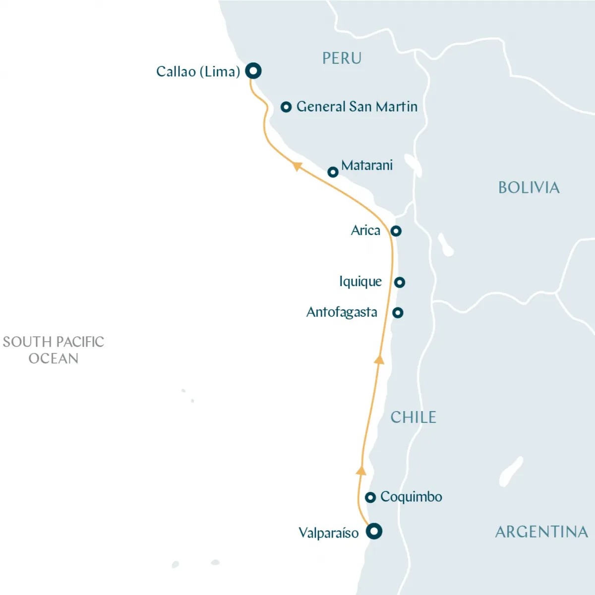 Вальпараисо – Кокимбо – Антофагаста – Арика – Матарани – Генерал-Сан-Мартин – Кальяо (Лима)