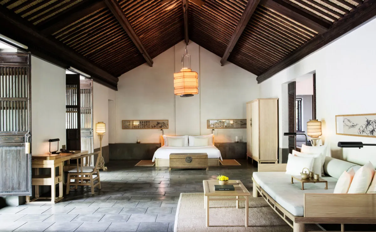На территории площадью 14 гектаров расположены просторные номера, люксы и двухэтажные виллы с массажными комнатами и видами на лесные поляны. В нескольких минутах ходьбы находится храм Линьинь, основанный в IV веке, а всего в шести километрах – знаменитое Западное озеро, объект Всемирного наследия ЮНЕСКО. Дорога до центра Ханчжоу занимает около 20 минут, открывая виды на чайные и шелковые плантации, прославленные еще Марко Поло.