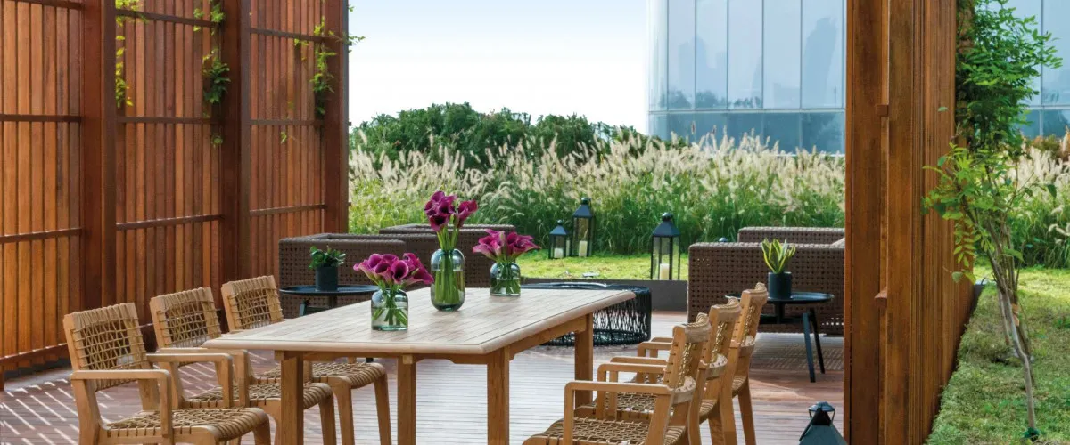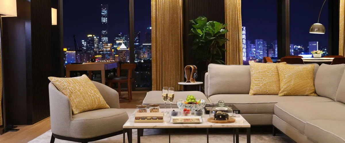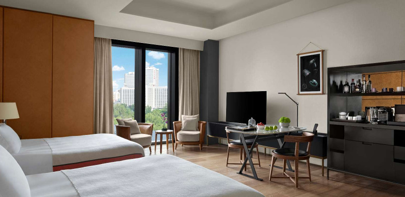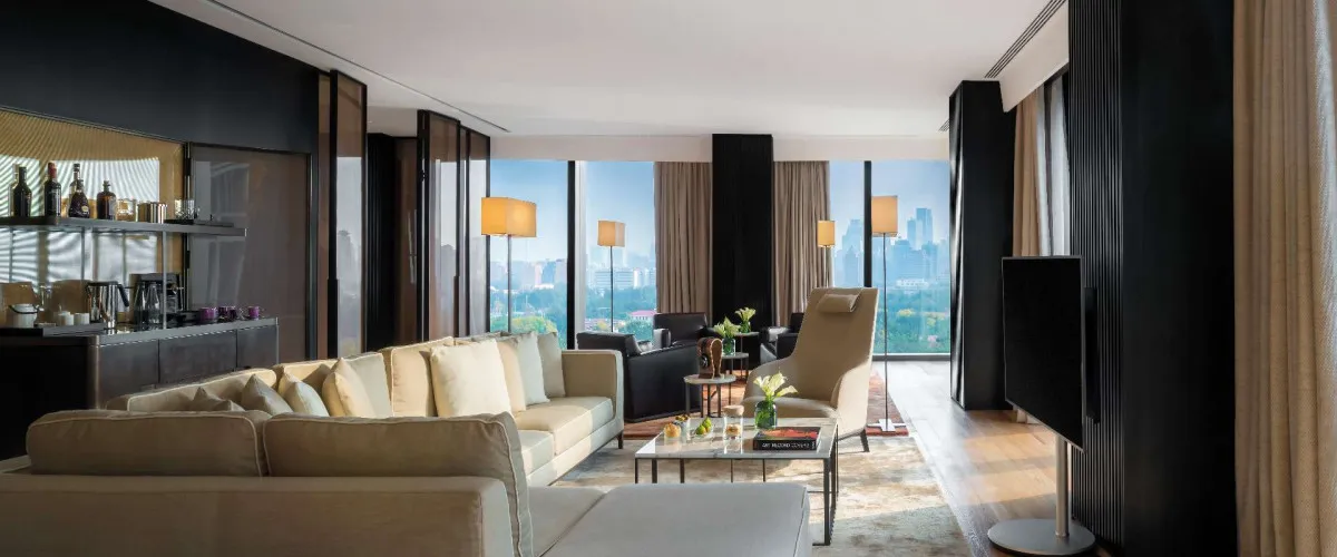 170-214 м2, двуспальная кровать размера «super king-size», отдельная гостиная, гардеробная, окна от пола до потолка с видом на реку Лянма и панораму Пекина. Количество гостей: 3Terrace Suite