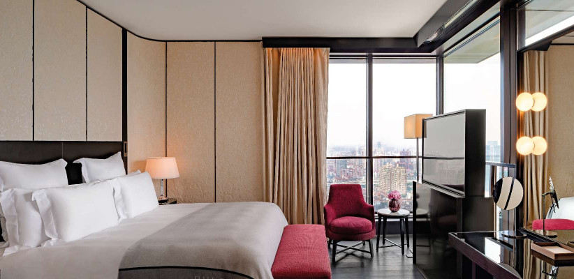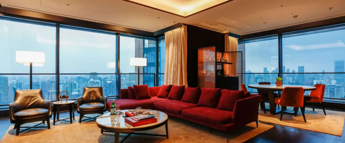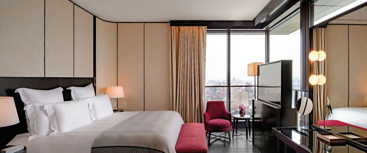 81-124 м2, двуспальная кровать размера «king-size», отдельная гостиная, гардеробная, круглосуточные услуги дворецкого, окна от пола до потолка с видом на Центральный парк, реку и центр Шанхая. Количество гостей: 3Deluxe Suite