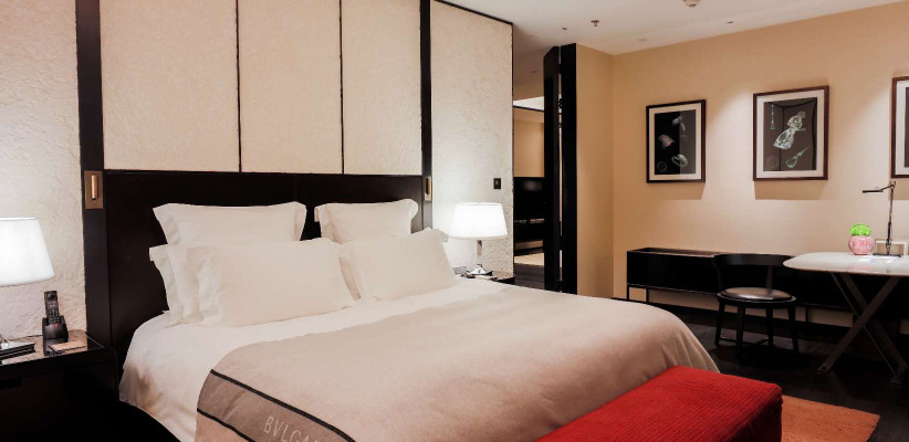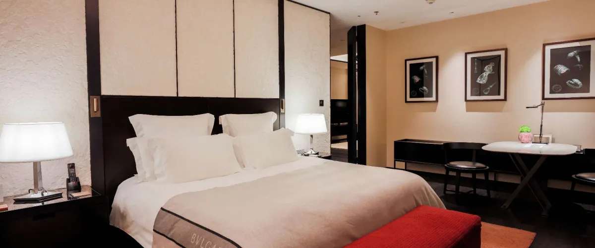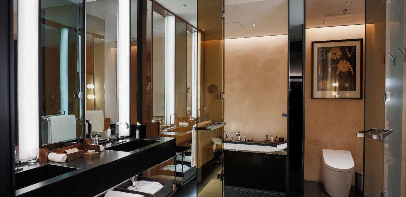 двуспальная кровать размера «super king-size», отдельная гостиная, столовая на восемь персон, кабинет с библиотекой, гардеробные, VR-гарнитуры, круглосуточные услуги дворецкого, окна от пола до потолка с панорамным видом на сверкающую набережную ВайтаньThe BVLGARI Suite