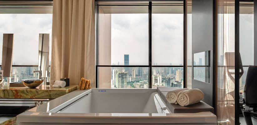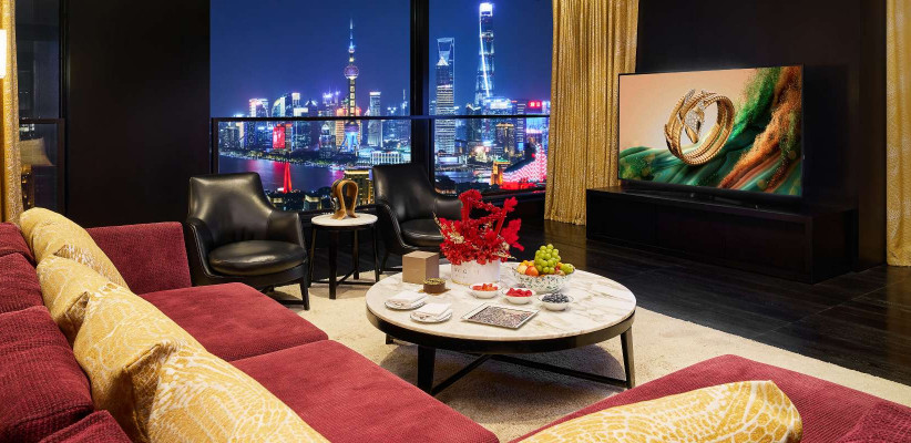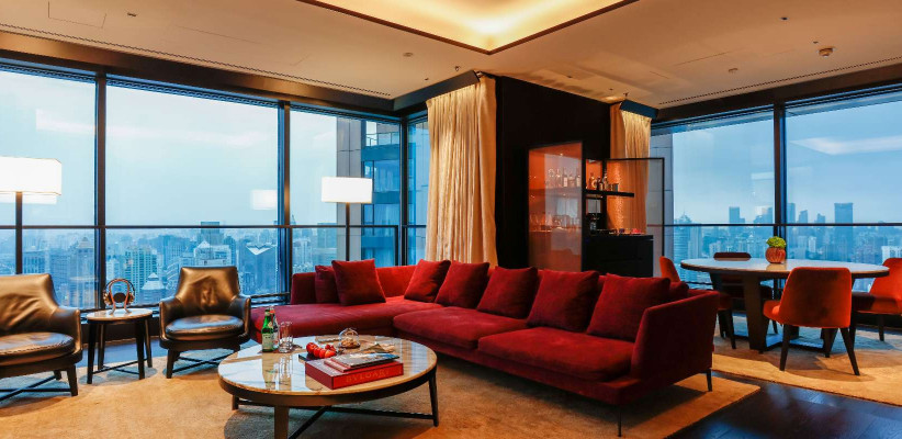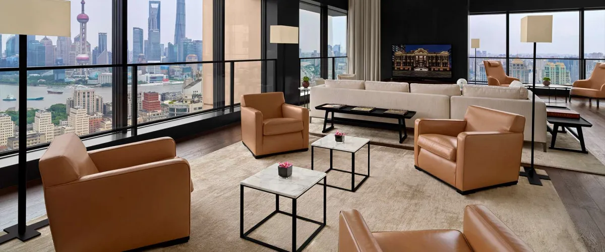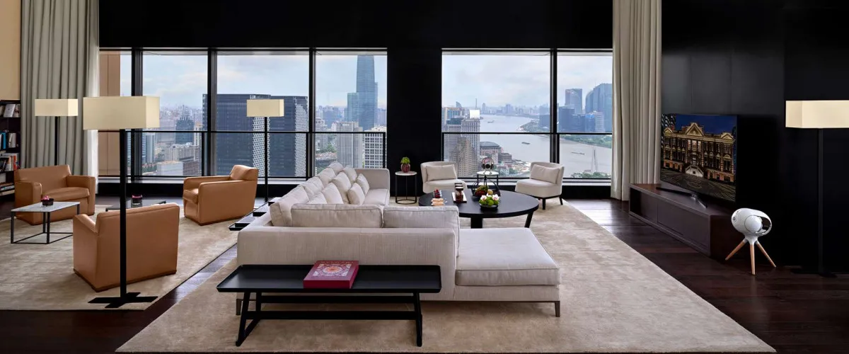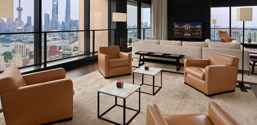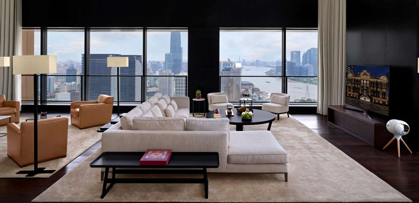 400 м2, двуспальная кровать размера «super king-size», доступ на частном лифте, изысканная дизайнерская мебель, отдельная гостиная, столовая, библиотека, бар, сауна, СПА-кабинет, круглосуточные услуги дворецкого, окна от пола до потолка с видом на набережную Вайтань и реку Хуанпу. Количество гостей: 3