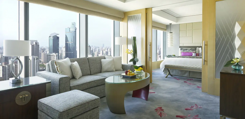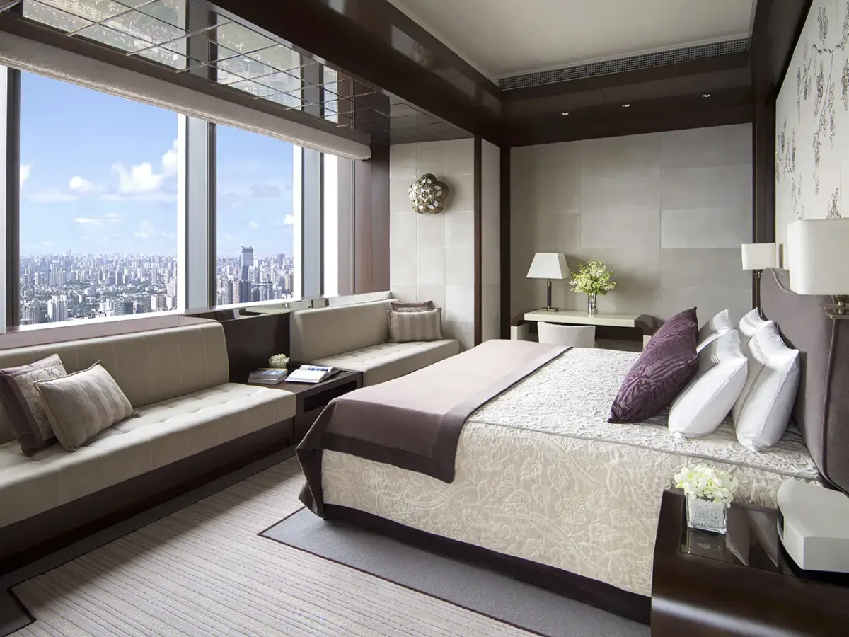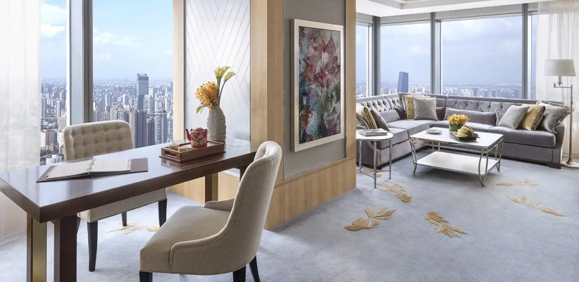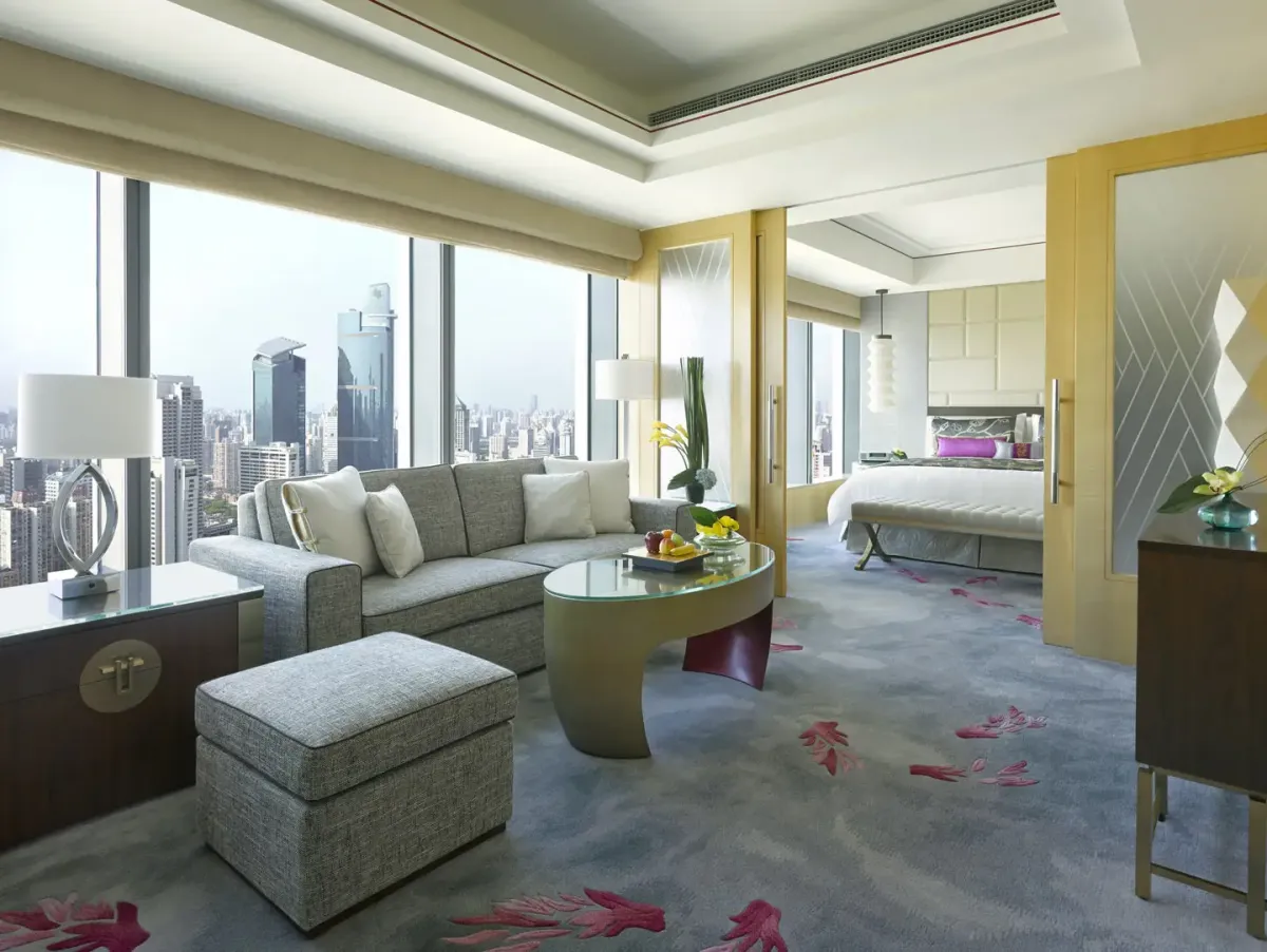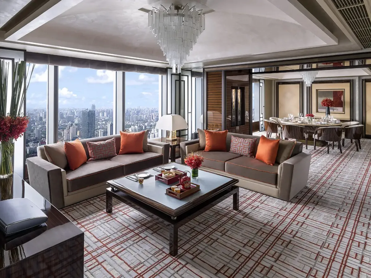 168 м2, двуспальная кровать размера «king-size», отдельная гостиная, обеденная зона, гардеробная, произведения искусства, клубные привилегии, окна от пола до потолка, панорамный вид на Пудун и ПусиShangri-La Suite