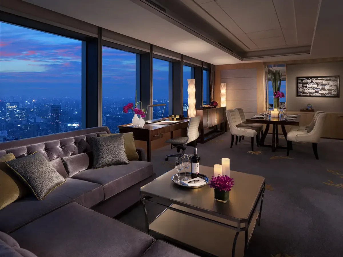 168 м2, смежные номера, две спальни, двуспальные кровати размера «king-size» или односпальные кровати, отдельная гостиная, гардеробная, клубные привилегии, окна от пола до потолка, вид на город