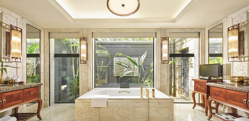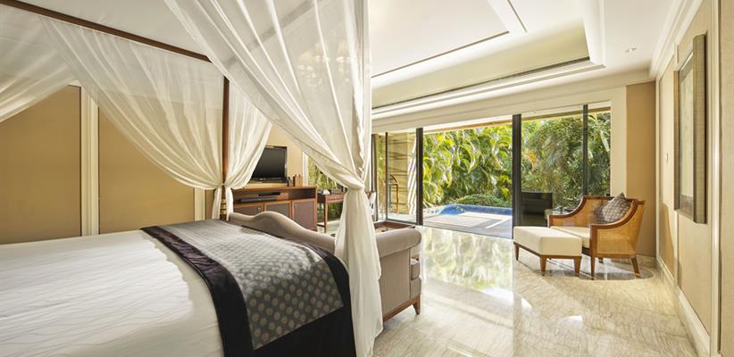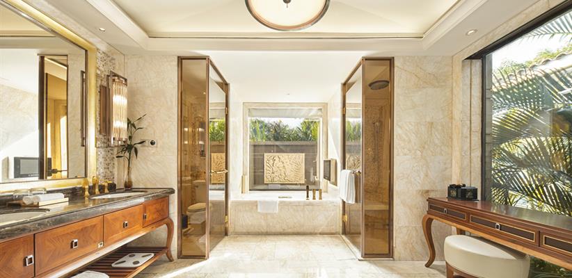256 м2, с видом на сад, двумя частными бассейнами, террасой и джакузи. В номере: три спальни с king-size кроватями или односпальными, рабочий стол, гостиная, софа, телевизор, обеденная зона, гардеробная, мраморная ванная комната с двойной раковиной и тропическим душем.Presidential Villa