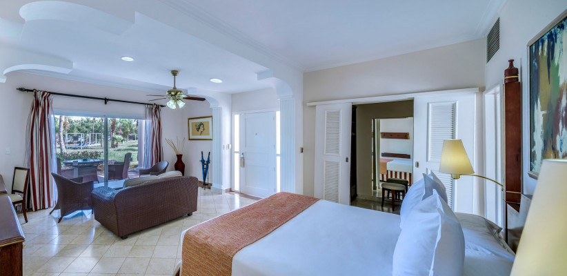 40 м2, номер с одной кроватью king-size или двумя односпальными кроватями, зоной отдыха, балконом с видом на сад.Paradisus Junior Suite Sea View