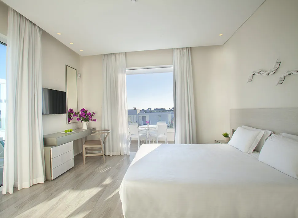 мебелированная терраса с выходом к бассейну, спальня с двуспальной кроватью размера king-size или с двумя односпальными кроватями, кресло с кофейным столиком, рабочее место.Superior Room/ Супериор