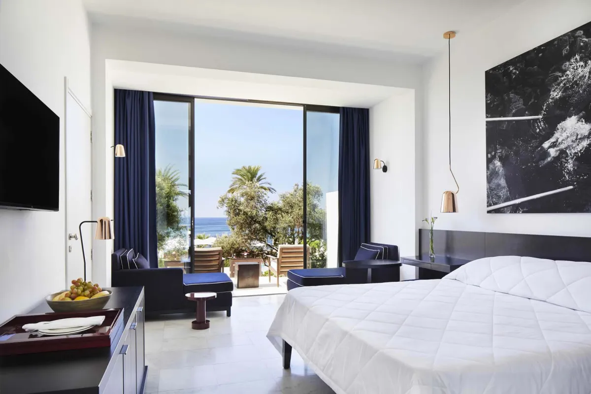 28 м2, мебелированный балкон или терраса с видом на окрестности или остров, спальня с двуспальной кроватью, два кресла с кофейным столиком, мраморная ванная комната. Максимальное количество гостей: 2 или 3.Superior Room/ Супериор