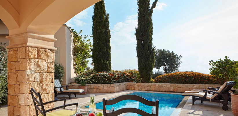 174 м2, количество гостей: 5Люкс «Афродита» с собственным бассейном, видом на поле для гольфа и море
